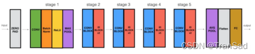 从stage2开始,每个stage都是先来一个convolution_block,再接若干个identity_block。(如下图是ResNet网络样式图。其中蓝色的是convolution_block,红色的是identity_block)