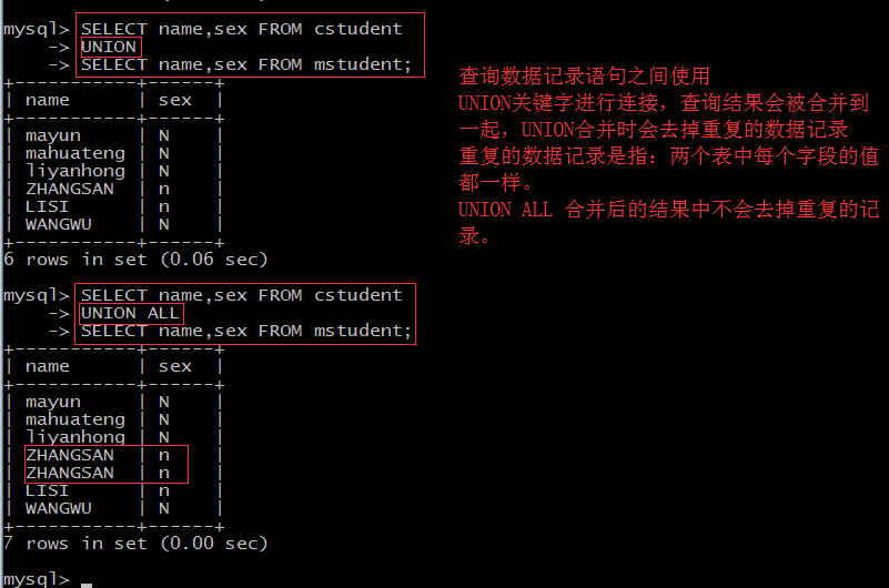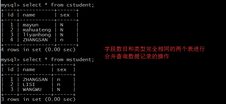 并(UNION):并操作是把具有相同字段数目和字段类型的两个或多个表合并到一起。