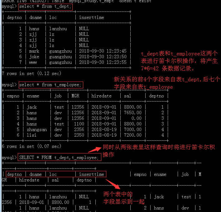 2.笛卡尔积:两个表之间进行笛卡尔积后形成新的关系中字段两个表中的会合并在一起,数据记录会进行组合,比如第一个表中有3条记录,第二个表中有5条记录,两个表经过笛卡尔积操作后将一共会产生3*5=15 种数据记录。