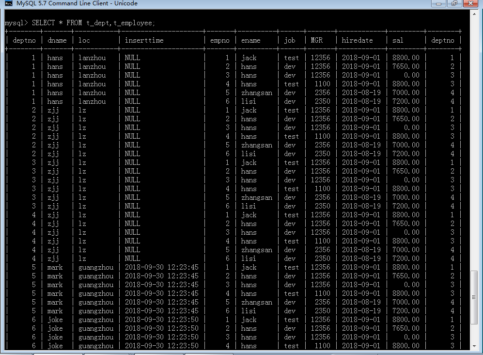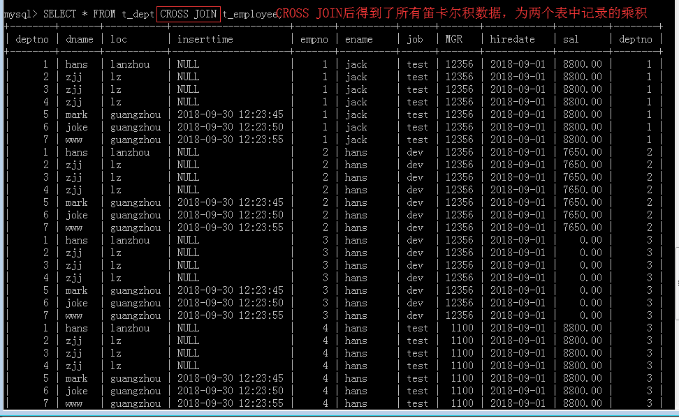 3.交叉连接(CROSS JOIN):交叉连接,实际上就是表关系笛卡尔积后的没有经过条件筛选后所有数据记录,不需要任何匹配条件。