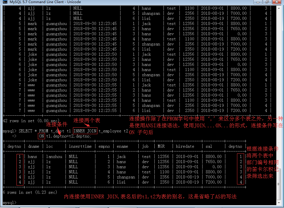 1. 内连接查询:保留表关系中所有匹配的数据记录,舍弃不匹配的记录,注意,是只会保留符合匹配条件的记录,根据匹配条件分为:自然连接(NATURAL JOIN)、等值连接、不等连接。