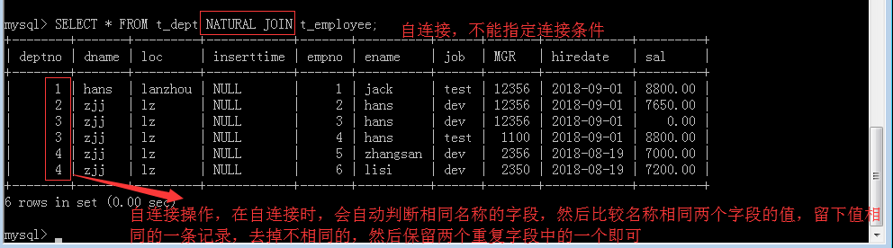 自然连接:在笛卡尔积的数据记录中,首先自动根据表关系中相同名称的字段进行记录匹配(即只保留两个同名的字段下值相同的这条记录),然后去除重复字段(重复的字段保留一个),使用关键字 NATURAL JOIN来进行自连接查询操作,自连接自动完成,无法指定连接条件。查询举例: