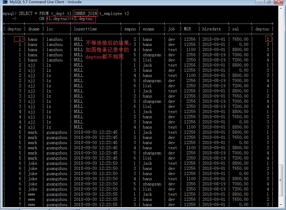 如图中结果,等值连接相比自然连接,只是没有去掉重复的字段deptno。