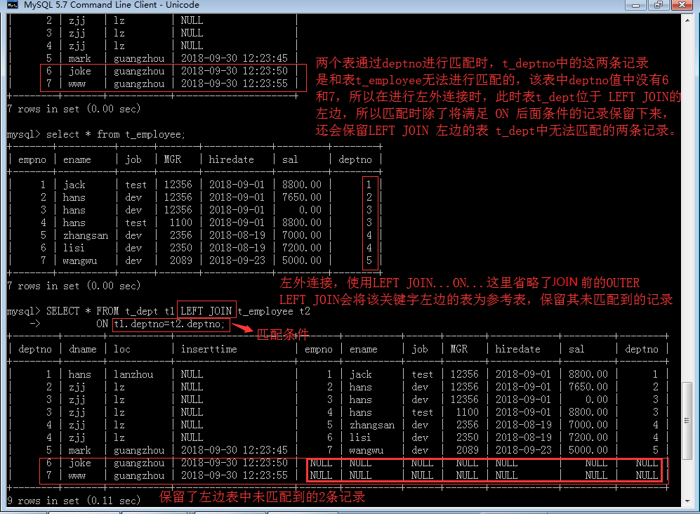左外连接(LEFT JOIN):外连接查询中的左外连接,使用关键字 LEFT JOIN....ON....来实现,就是在笛卡尔积新关系中执行匹配条件时,除了保留满足ON关键字后条件的记录外,还会以关键字 LEFT JOIN左边的表为参考表,保留左边表中未匹配的所有记录。举例说明: