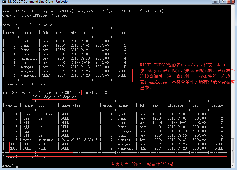 右外连接(RIGHT JOIN):外连接查询中的右外连接,使用关键字 RIGHT JOIN....ON....来实现,就是在笛卡尔积新关系中执行匹配条件时,除了保留满足ON关键字后条件的记录外,还会以关键字 RIGHT JOIN右边的表为参考表,保留右边表中未匹配的所有记录。举例说明:
