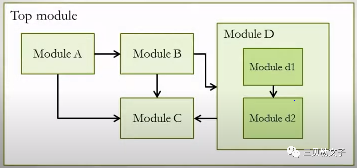 }其实,在编写verilog的过程中也有类似的操作,叫做module的调用,在整个verilog工程中有一个主要的module,叫做top module,top module可以调用其他的子module,关系图如下: