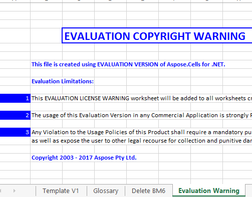 ps:由于 Aspose.Cells 插件 是收费插件,需要在使用插件前,设置一下许可证,否则在生成的Excel 中 会出现一个名叫 Evaluation Warning 的 Sheet.如图所示: