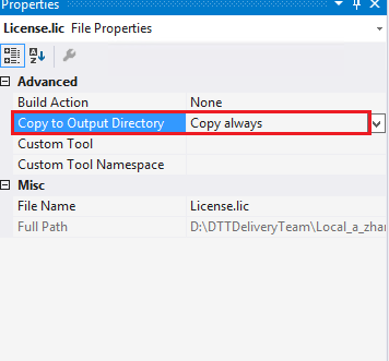 2.2.2 修改证书属性。在解决方案中,右击 License.lic选择属性,修改 Copy to Ouput Directory 属性为 Copy always
