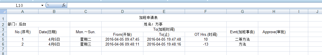 using System.Linq; using System.IO; using Aspose.Cells; //using Microsoft.Office.Interop.Excel; //using System.Reflection; public class ToOverTimexls : IHttpHandler { public void ProcessRequest(HttpContext context) { int oname = 0, years = 0, month = 0; if (context.Request["name"] != null) { oname = int.Parse(context.Request["name"]); } if (context.Request["years"] != null) { years = int.Parse(context.Request["years"]); } if (context.Request["month"] != null) { month = int.Parse(context.Request["month"]); } //oname = 1; years = 2016; month = 1; using (WorkRecordEntities db = new WorkRecordEntities()) { IList<OverTime> list = db.OverTime.Where(o => o.StaffID == oname && o.StartTime.Year == years && o.StartTime.Month == month).ToList(); var name = db.Staff.Where(o => o.StaffID == oname).FirstOrDefault().FullName; //建立一个Excel进程 Application // string SavaFilesPath = System.Configuration.ConfigurationManager.AppSettings["DownLoad"] + Guid.NewGuid() + ".xls"; string SavaFilesPath = context.Server.MapPath("~/Download") + "\\" + Guid.NewGuid() + ".xls"; // Application excelApplication = new Application(); // //默认值为 True。如果不想在宏运行时被无穷无尽的提示和警告消息所困扰,请将本属性设置为 False;这样每次出现需用户应答的消息时,Microsoft Excel // // 将选择默认应答。 // //如果将该属性设置为 False,则在代码运行结束后,Micorosoft Excel 将该属性设置为 True,除非正运行交叉处理代码。 // //如果使用工作簿的 SaveAs 方法覆盖现有文件,“覆盖”警告默认为“No”,当 DisplayAlerts 属性值设置为 True 时,Excel 选择“Yes”。 // excelApplication.DisplayAlerts = false; // // 建立或打开一个 Workbook对象生成新Workbook // Workbook workbook = excelApplication.Workbooks.Add(Missing.Value); // //int x = 2; // Worksheet lastWorksheet = (Worksheet)workbook.Worksheets.get_Item(workbook.Worksheets.Count); // Worksheet newSheet = (Worksheet)workbook.Worksheets.Add(Type.Missing, lastWorksheet, Type.Missing, Type.Missing); // //表头 // newSheet.Cells[4, 1] = "No.(序号)"; // newSheet.Cells[4, 2] = "Date(日期)"; // newSheet.Cells[4, 3] = "Mon.~Sun."; // newSheet.Cells[4, 4] = "From(开始)"; // newSheet.Cells[4, 5] = "To(止)"; // newSheet.Cells[4, 6] = "OT Hrs.(时间)"; // newSheet.Cells[4, 7] = "Evnt(加班事由)"; // newSheet.Cells[4, 8] = "Approve(审批)"; // newSheet.Cells[3, 4] = "To(加班时间)"; // newSheet.Cells[1,4]="加班申请表"; // newSheet.Cells[2,1]="部门:后台"; newSheet.Cells[2, 2] = "后台"; // newSheet.Cells[2, 6] = "姓名:"+name; // //newSheet.Cells[2, 7] = name; // newSheet.get_Range("A1", "H1").Merge(newSheet.get_Range("A1", "H1").MergeCells); // newSheet.get_Range("A2", "D2").Merge(newSheet.get_Range("A2", "D2").MergeCells); // newSheet.get_Range("F2", "H2").Merge(newSheet.get_Range("F2", "H2").MergeCells); // newSheet.get_Range("A3", "A4").Merge(newSheet.get_Range("A3", "A4").MergeCells); // newSheet.get_Range("B3", "B4").Merge(newSheet.get_Range("B3", "B4").MergeCells); // newSheet.get_Range("C3", "C4").Merge(newSheet.get_Range("C3", "C4").MergeCells); // newSheet.get_Range("D3", "F3").Merge(newSheet.get_Range("D3", "F3").MergeCells); // newSheet.get_Range("G3", "G4").Merge(newSheet.get_Range("G3", "G4").MergeCells); // newSheet.get_Range("H3", "H4").Merge(newSheet.get_Range("H3", "H4").MergeCells); // newSheet.get_Range("A3", "H3").Interior.ColorIndex = 15; // newSheet.get_Range("A4", "H4").Interior.ColorIndex = 15; // Range range1 = newSheet.get_Range("A1", "H1"); // range1.HorizontalAlignment = XlHAlign.xlHAlignCenter; // range1.WrapText = true; // Range range = newSheet.get_Range("A3", "H4"); // range.HorizontalAlignment = XlHAlign.xlHAlignCenter; // range.Font.Size = 10; // range.Borders.LineStyle = 1; // //设置边框 range.BorderAround(XlLineStyle.xlContinuous, XlBorderWeight.xlMedium, XlColorIndex.xlColorIndexAutomatic, System.Drawing.Color.Black.ToArgb()); // range.Borders.get_Item(XlBordersIndex.xlEdgeBottom).Weight = XlBorderWeight.xlMedium; // range.WrapText = true; var x = 3; // var x = 5; // for (var i = 0; i < list.Count; i++) // { // newSheet.Cells[x + i, 1] = i + 1; // newSheet.Cells[x + i, 2] = list[i].StartTime.Month + "月" + list[i].StartTime.Day + "日"; // newSheet.Cells[x + i, 3] = GetWeekCHA((list[i].StartTime.DayOfWeek).ToString()); // newSheet.Cells[x + i, 4] = list[i].StartTime.ToString("yyyy/MM/dd HH:mm:ss"); // newSheet.Cells[x + i, 5] = list[i].EndTime.ToString("yyyy/MM/dd HH:mm:ss"); // int ts = (list[i].EndTime - list[i].StartTime).Hours; // newSheet.Cells[x + i, 6] = ts; // newSheet.Cells[x + i, 7] = list[i].Description; // newSheet.Cells[x + i, 8] = ""; // } // newSheet.Cells.Columns.AutoFit(); // //删除原来的空Sheet // ((Worksheet)workbook.Worksheets.get_Item(1)).Delete(); // ((Worksheet)workbook.Worksheets.get_Item(1)).Delete(); // ((Worksheet)workbook.Worksheets.get_Item(1)).Delete(); // //设置默认选中是第一个Sheet 类似于Select(); // ((Worksheet)workbook.Worksheets.get_Item(1)).Activate(); // try // { // workbook.Close(true, SavaFilesPath, Missing.Value); // } // catch (Exception e) // { // throw e; // } // UploadExcel(SavaFilesPath, true); // excelApplication.Quit(); Workbook workbook = new Workbook(); Worksheet worksheet = workbook.Worksheets[0]; Style styleTitle = workbook.Styles[workbook.Styles.Add()];//新增样式 styleTitle.HorizontalAlignment = TextAlignmentType.Center;//文字居中 worksheet.PageSetup.Orientation = PageOrientationType.Landscape;//横向打印 worksheet.PageSetup.Zoom = 100;//以100%的缩放模式打开 worksheet.PageSetup.PaperSize = PaperSizeType.PaperA4; Range range; Cell cell; range = worksheet.Cells.CreateRange(0, 0, 1, 8); range.Merge(); range.RowHeight = 20; range.ColumnWidth = 15; cell = range[0, 0]; cell.PutValue("加班申请表"); cell.SetStyle(styleTitle); range = worksheet.Cells.CreateRange(1, 0, 1, 2); range.Merge(); range.RowHeight = 1