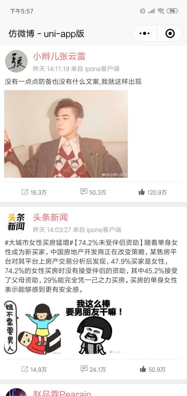 开发内容:开发一个仿微博小程序首页的复杂长列表,支持下拉刷新、上拉翻页、点赞。