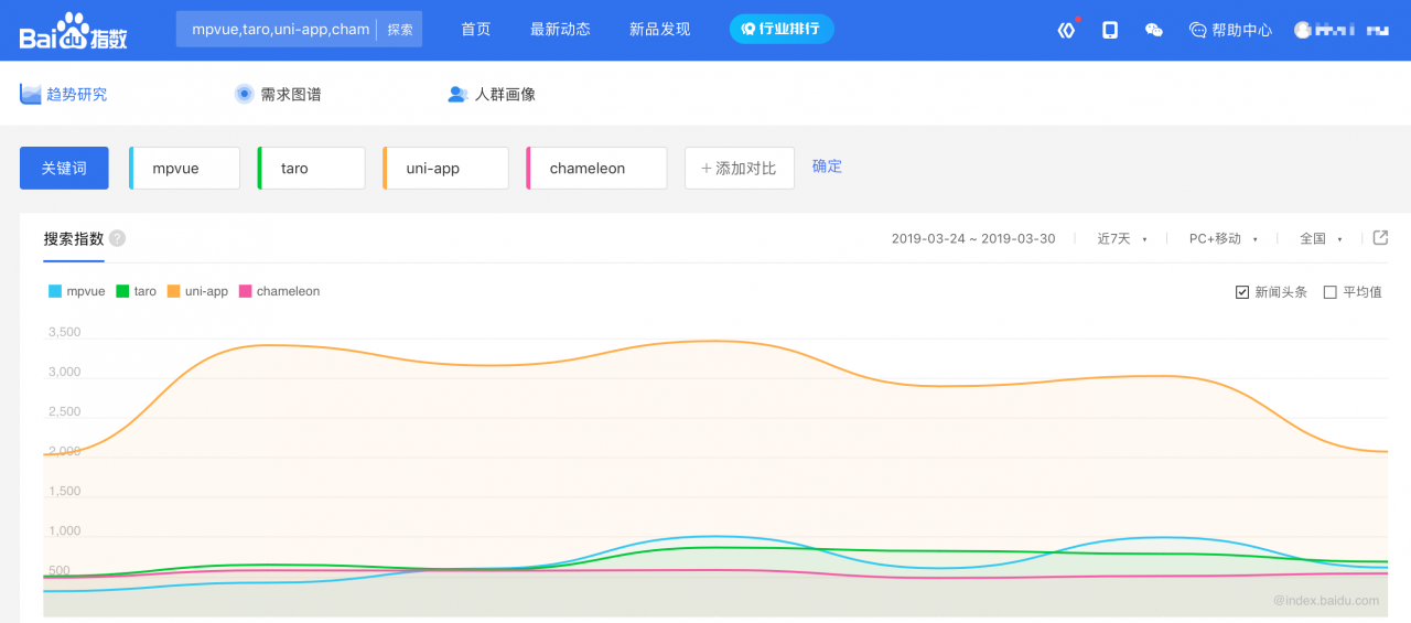 百度指数代表了开发者的搜索量和包含关键字的网页数量。如下是各跨端框架近7天(2019-03-24 ~ 2019-03-30)的百度指数: