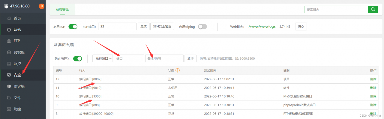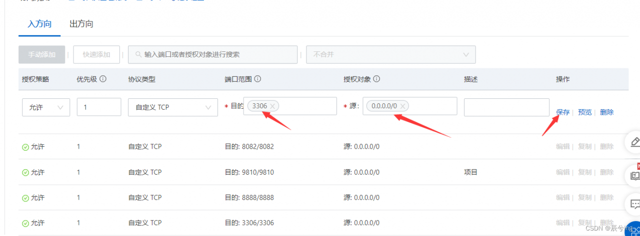 点击安全→开放3306(Mysql默认端口)以及项目端口号