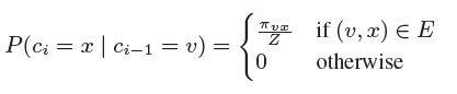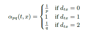 假设现在游走序列从t走到v,这时候需要算出三个系数,分别作为控制下一步走向方向的偏置α