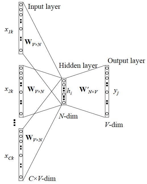和 Skip-gram 的模型并联不同,这里是输入变成了多个单词,所以要对输入处理下(一般是求和然后平均),输出的 cost function 不变。