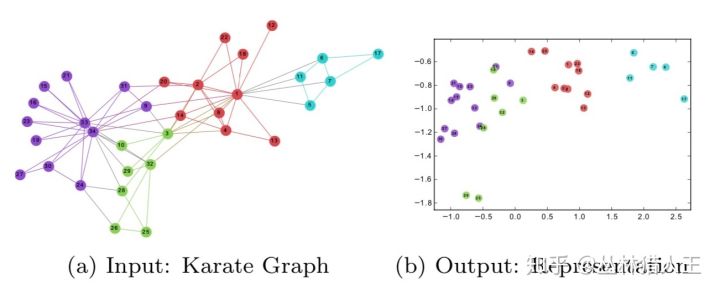 Graph Embedding研究的就是用向量来表示图上的节点,且保留了这样一个重要的性质:在图上距离较近的节点,在向量空间中的距离也较近。下图这个例子可以帮助我们理解这个过程: