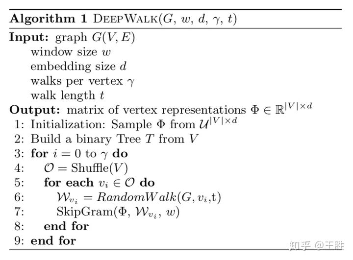 其中第2步是构建Hierarchical Softmax,第3步对每个节点做γ次随机游走,第4步打乱网络中的节点,第5步以每个节点为根节点生成长度为t的随机游走,第7步根据生成的随机游走使用skip-gram模型利用梯度的方法对参数进行更新。