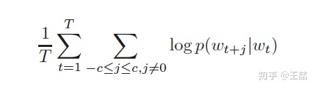 有了训练样本之后我们就可以着手定义优化目标了,既然每个词 w t w_twt 都决定了相邻词 w t j w_{t_j}wtj,基于极大似然,我们希望所有样本的条件概率 p ( w t + j ∣ w t ) p(w_{t+j}|w_t)p(wt+j∣wt) 之积最大,这里我们使用log probability。我们的目标函数有了: