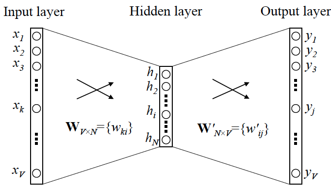 假设语料库中词的数量为 V VV,Word2vec的网络结构可表示为如下形式:
