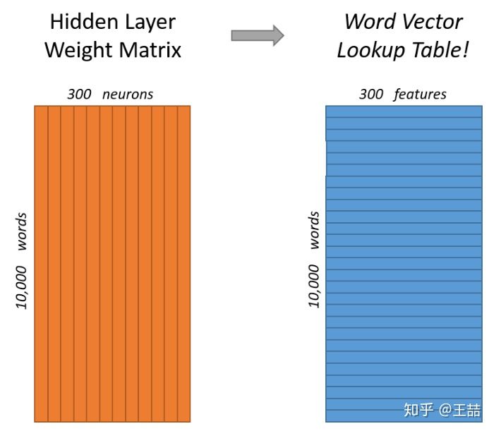 在获得输入向量矩阵 W V × N \pmb{W}_{V \times N}WWWV×N 后,其中每一行对应的权重向量就是通常意义上的“词向量”,也就是上面所说的 v x \pmb{v}_xvvvx。于是,这个权重矩阵自然转换成了 Word2vec 的查找表(lookup table)。例如,输入向量是 10000 个词组成的 one-hot 向量,隐层维度是 300 维,那么输入层到隐层的权重矩阵为 10000 × \times× 300 维。在转换为词向量查找表后,每行的权重即成了对应词的 Embedding 向量。
