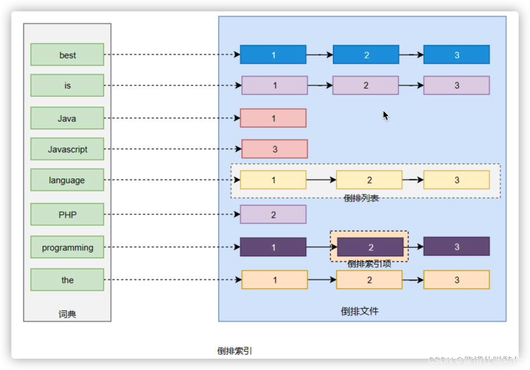 这种由属性值来确定记录的位置的结构就是倒排索引。带有倒排索引的文件我们称为倒排文件。