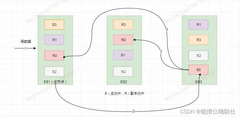 客户端向 ES1 节点(协调节点)发送写请求,通过路由计算公式得到值为 0,则当前数据应被写到主分片 S0 上。