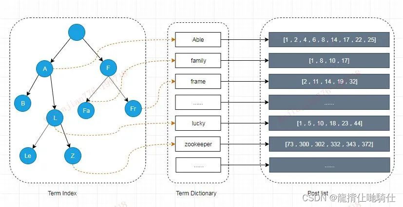 词典(Term Dictionary):或字典,是词条 Term 的集合。搜索引擎的通常索引单位是单词,单词词典是由文档集合中出现过的所有单词构成的字符串集合,单词词典内每条索引项记载单词本身的一些信息以及指向“倒排列表”的指针。