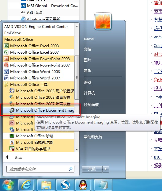 第二步:粘贴图片到Word的一个工具--Microsoft Office Document Imaging里面,该工具默认不安装,需要手动安装