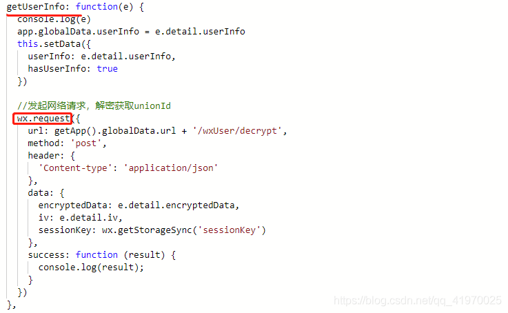 (2)在定义了按钮的 对应 js 中,编写getUserInfo接口请求后的成功函数;在其中对 开发者服务器 发起网络请求(开发者编写的 解密接口 )