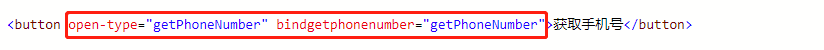 注: 需将 open-type 和 bindgetphonenumber 均值定为 “getPhoneNumber” ;表明点击时先请求 小程序自身的getPhoneNumber接口