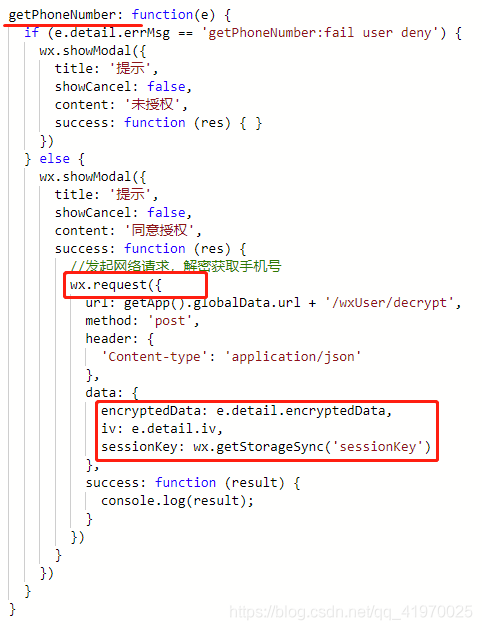 (2)在定义了按钮的 对应 js 中,编写getPhoneNumber接口请求后的成功函数;在其中对 开发者服务器 发起网络请求(开发者编写的 解密接口 )