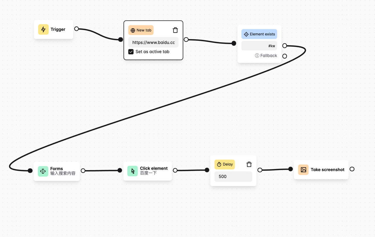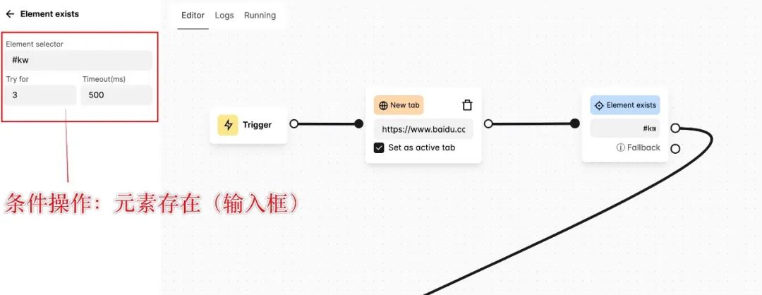 再添加一个条件操作节点「 Element exists 」,以百度搜索输入框元素存在作为执行条件