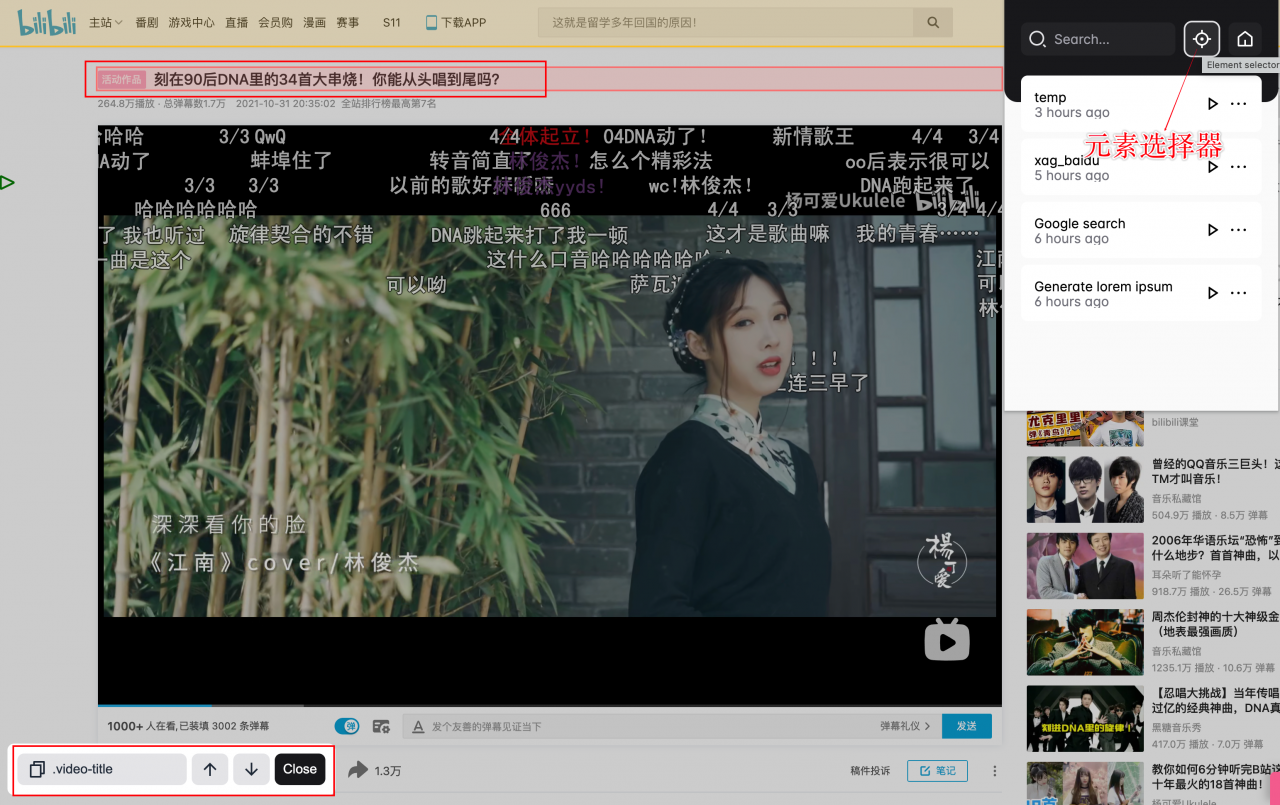 需要指出的是,Automa 还提供了网页元素选择器定位功能,只需要点击插件界面的「 Element Selector 」图标,然后选择目标控件,左下角就会显示控件的的选择器