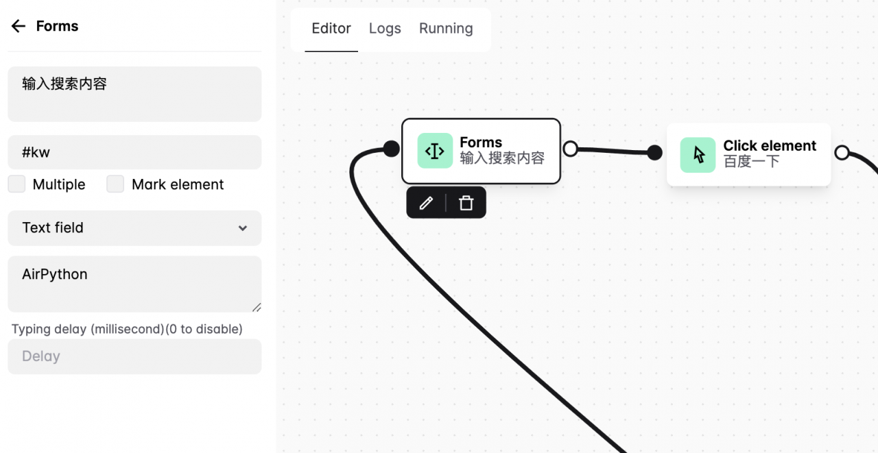 接着,通过操作「 Forms 」向输入框中输入内容,使用「 Click element 」操作模拟点击搜索按钮