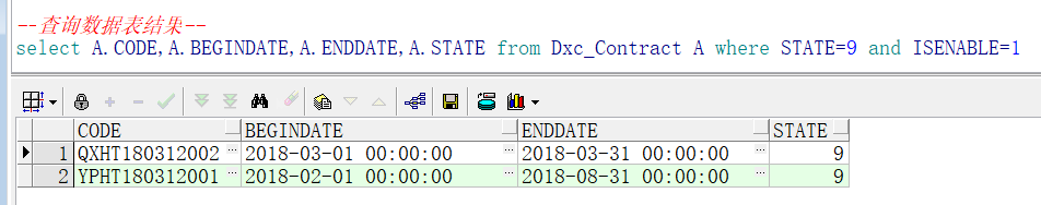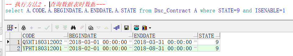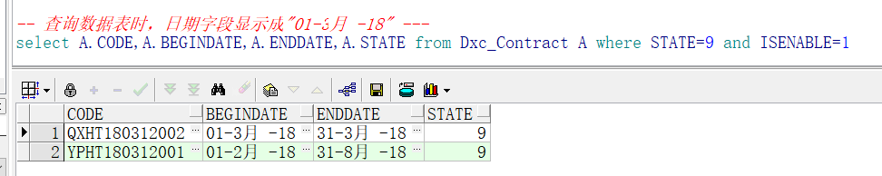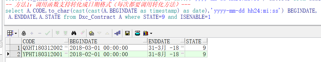 -- 方法1:调用函数支持转化成日期格式(每次都要调用转化方法)--- select A.CODE,to_char(cast(cast(A.BEGINDATE as timestamp) as date),'yyyy-mm-dd hh24:mi:ss') BEGINDATE, A.ENDDATE,A.STATE from Dxc_Contract A where STATE=9 and ISENABLE=1