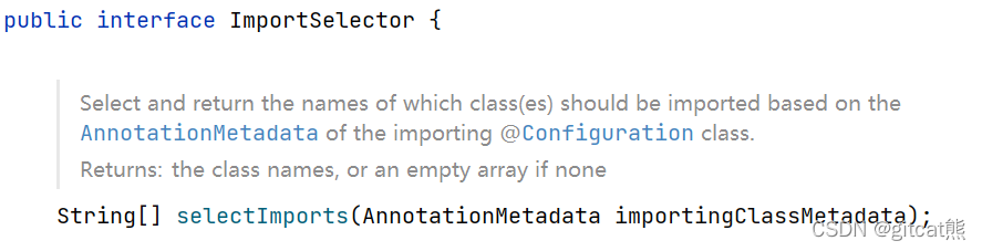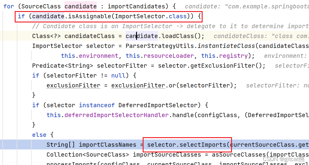 org.springframework.context.annotation.ConfigurationClassPostProcessor这个后处理器,最终处理@Import是这个方法org.springframework.context.annotation.ConfigurationClassParser#processImports,这方法中有如下判断,可以看到,如果import的是ImportSelector类型,就会调用selectImports获取要导入的类。
