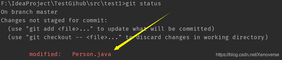 上面提示了我们,这个类里面有修改的操作。但是这个时候,你把person这个类里面改动的东西恢复原样。那么,status就不会提示改动的操作,一切以你文件是否“原样”为标准来判断。