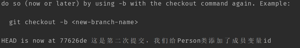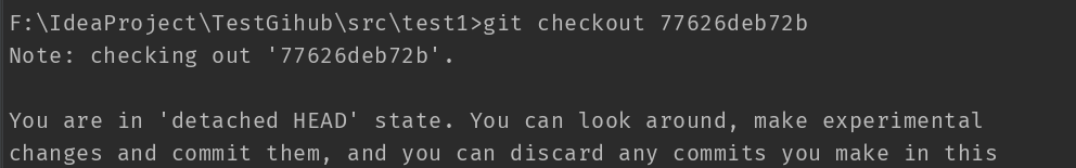 注意commit 后面的一串代码,这是一串哈希值,可以定位一个提交记录,只需要这一串的钱七位就可以找到一条提交记录。我们可以对这个提交进行详细的查看,使用指令:git checkout + 哈希值前几位(大于7位)