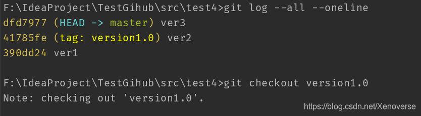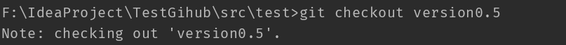 我们不仅可以查看历史的commit,我们还可以回溯到历史的commit去通过commit的标签名字,将历史某次的commit当作当前正在操作的commit,比如一个commit肥肠重要的时候。比如我想回到version0.5的这次commit进行一些操作