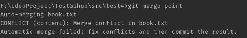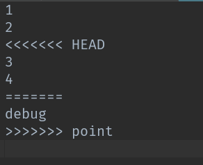 上面的信息提示我们有冲突,这个时候,我们来查看文字,就可以看到,从2开始,master版本的文字就是3和4,point分支就是debug ,我们需要手动解决冲突,