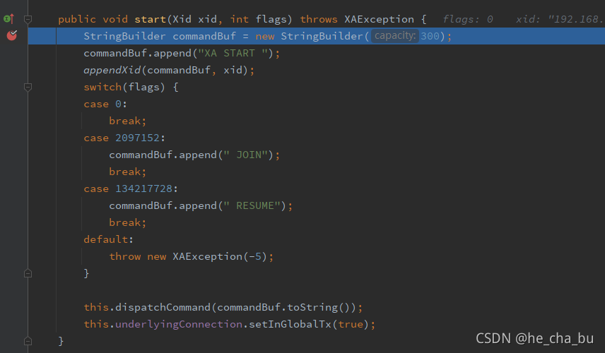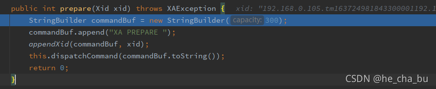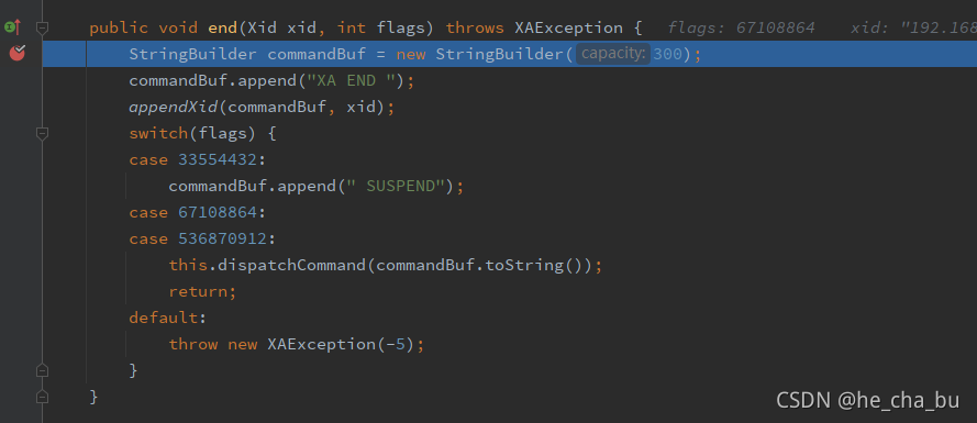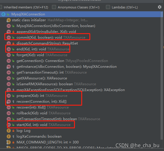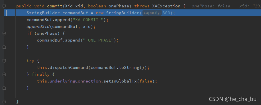 public class MysqlXAConnection extends MysqlPooledConnection implements XAConnection, XAResource {}然后查看其方法,发现里边有commit,end,prepare,start等。所以我们可以直接在这些方法debug,然后运行示例。