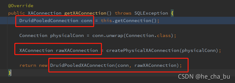 然后再查看返回的XAConnection是由Druid创建一个DruidPooledConnection和XAConnection的包装类DruidPooledXAConnection返回,源码如下: