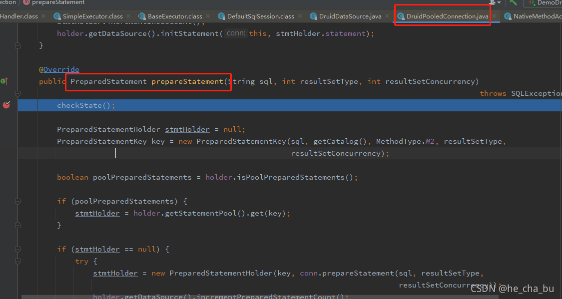 往下执行,就发现初始化的DruidPooledConnection开始工作,创建prepareStatement,这里基本可以知道Mysql调用start操作的时候就开始连接数据库执行操作,同样可从调用栈得知。