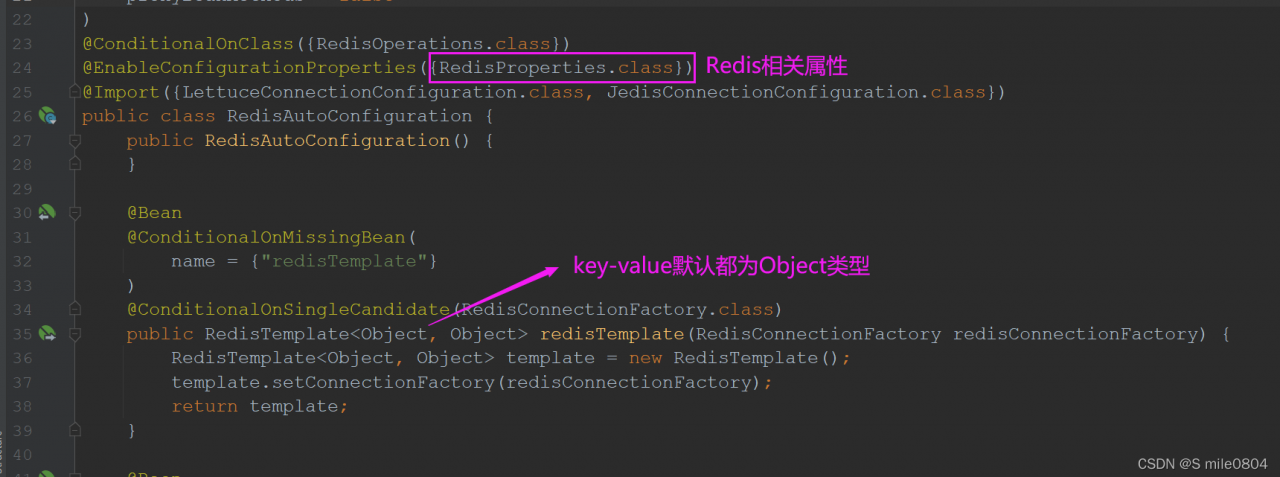 实际上,Spring Boot已经在RedisAutoConfiguration.class类中为我们自动配置了相关属性,Key-Value自动配置为<Object , Object>的数据类型,但一般情况下我们习惯key为String类型,所以我们需要编写一个配置类,重新配置key-value的数据类型、以及key-value的序列化方式,并注入Spring容器中去。