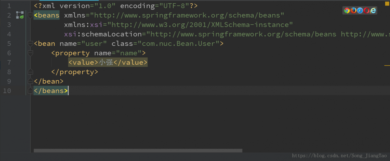 <bean></bean>这对标签元素的作用:当我们加载spring框架时,spring就会自动创建一个bean对象,并放入内存。相当于我们常规的new一个对象,而<property></property>中的value则是实现了“对象.set方法”,这里也体现了注入概念。