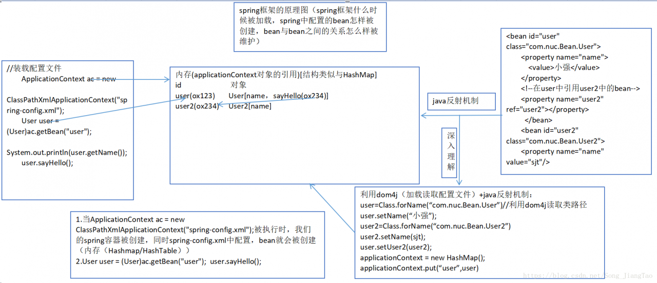 那么bean中的东西到底是怎么注入进去的?简单来讲,就是在实例化一个bean时,实际上就实例化了类,它通过反射调用类中set方法将事先保存在HashMap中的类属性注入到类中。这样就回到了我们java最原始的地方,对象.方法,对象.属性。