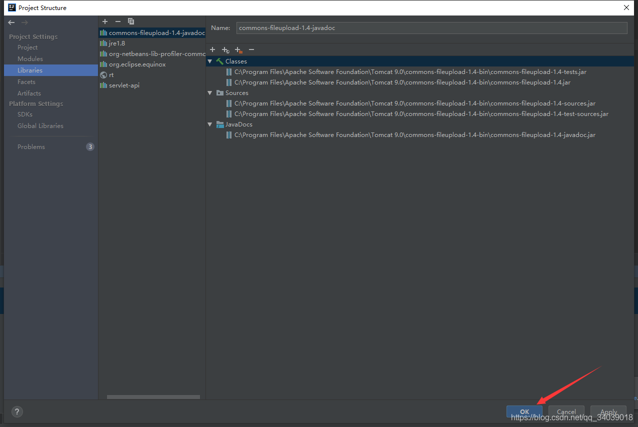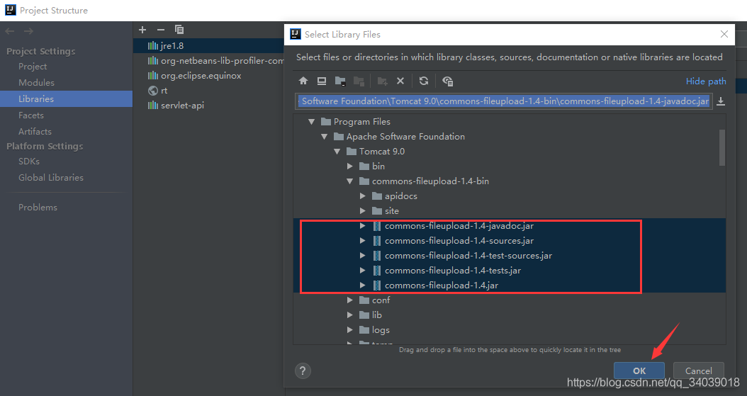然后选择刚刚的路径C:\Program Files\Apache Software Foundation\Tomcat 9.0\commons-fileupload-1.4-bin\commons-fileupload-1.4-javadoc.jar,并选择对应jar包,然后点击OK