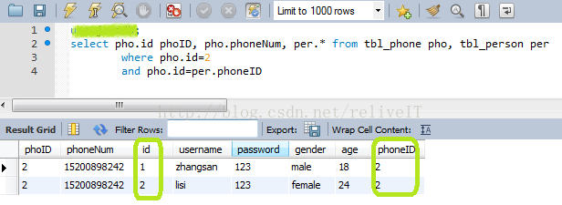 Phone [id=2, phoneNum=15200898242--------- persons=[Person [id=1, username=zhangsan, password=123, gender=male, age=18, phoneID=2], Person [id=2, username=lisi, password=123, gender=female, age=24, phoneID=2]]]