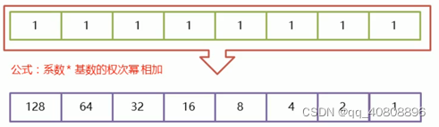 公式:系数*基数的权次幂相加;系数:每一【位】上的数;基数:几进制,就是几;权:从数值的右侧,以0开始,逐个+1增加;