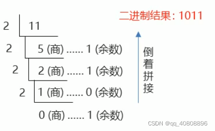 除基取余:使用源数据,不断的除以基数(几进制,基数就是几)得到余数,直到商为0,再将余数倒着拼起来即可。