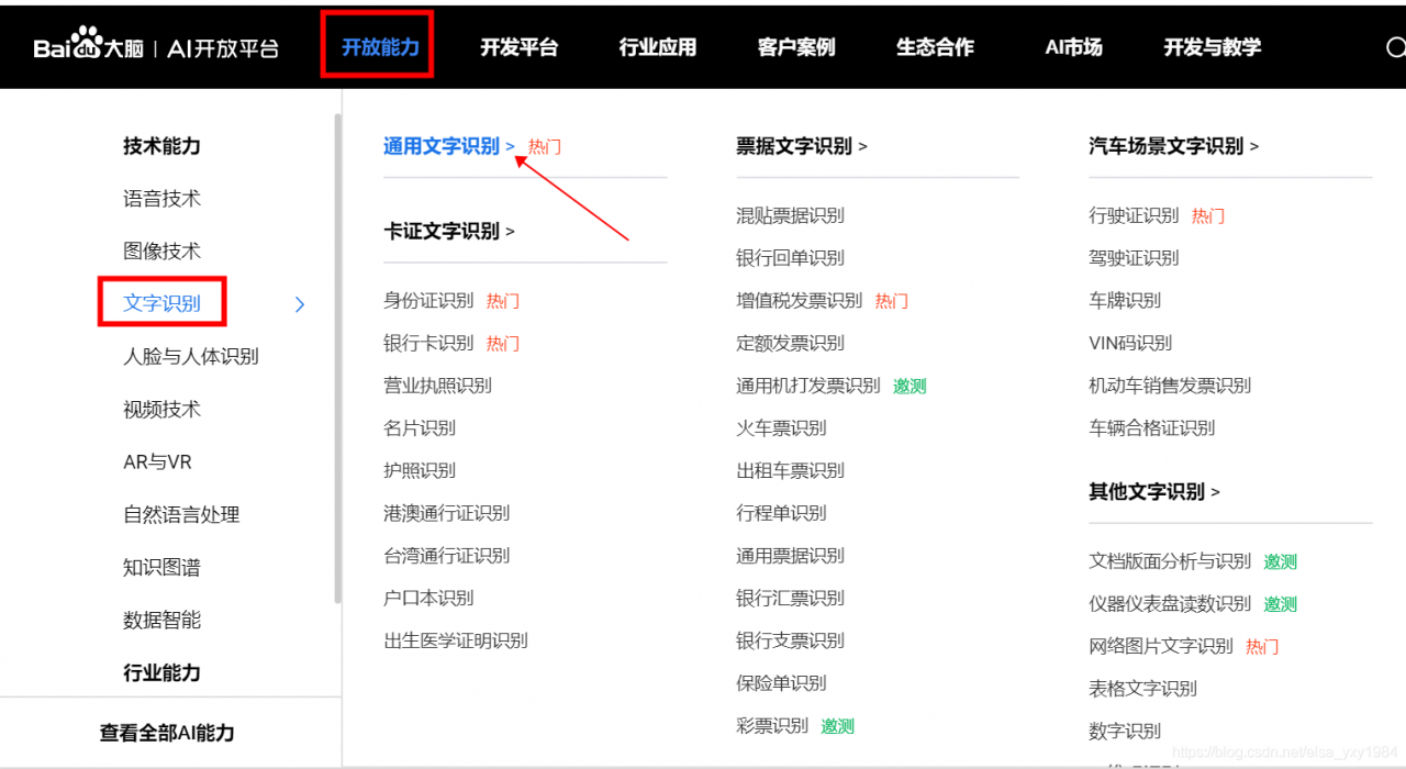 2、查看开放能力--->文字识别--->通用文字识别,并点击